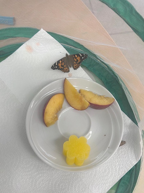 Bild 8: Der erste Schmetterling ist geschlüpft. Der Distelfalter benötigt Fruktose als Nahrung.